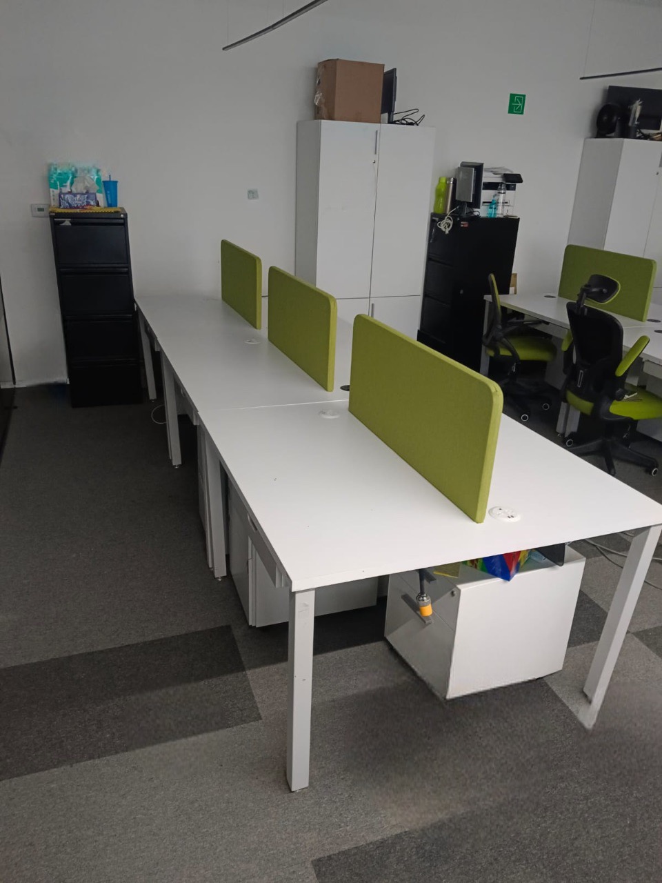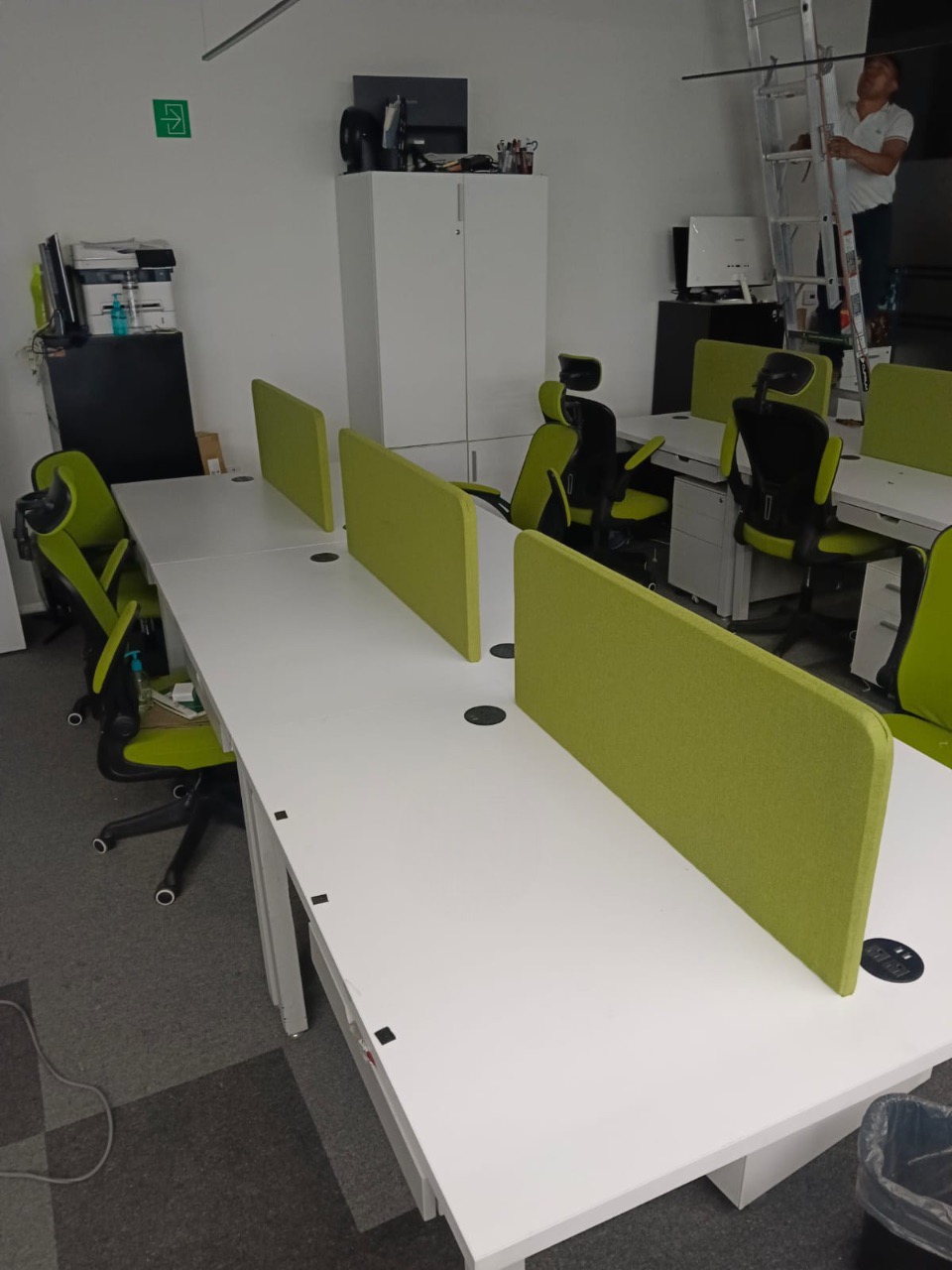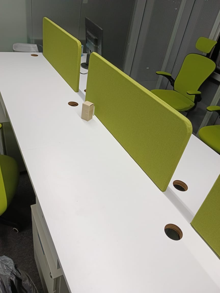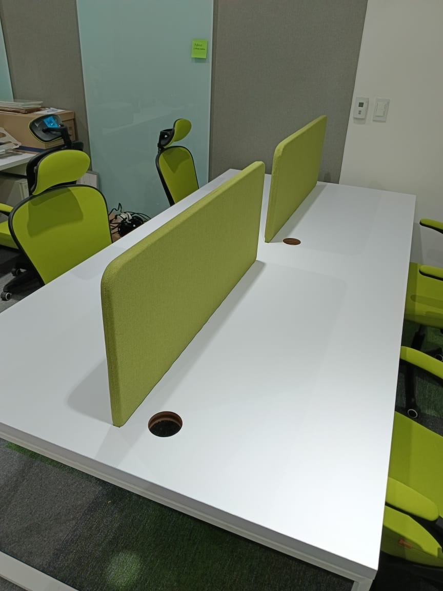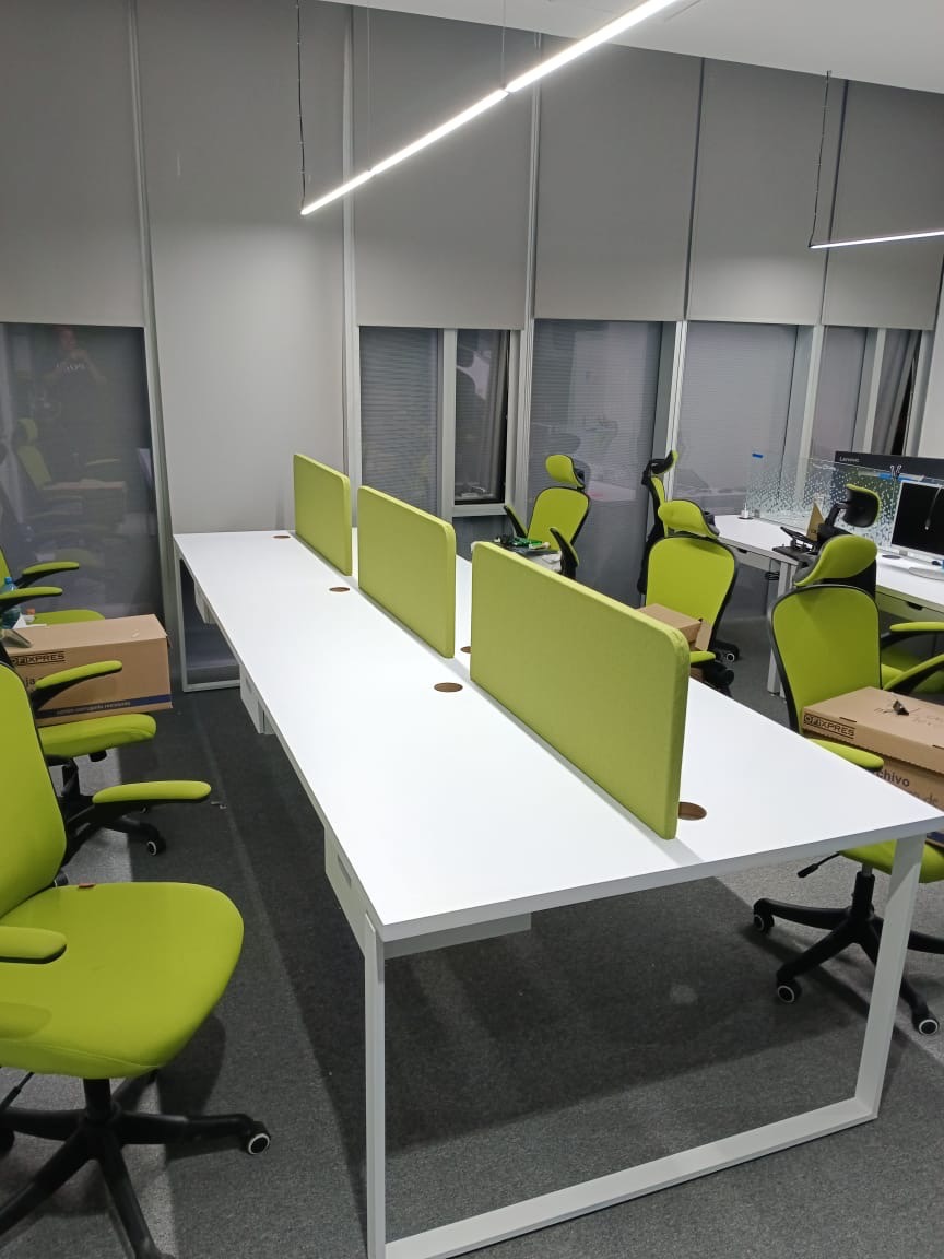 Se han fabricado escritorios con cubierta de MDF en color blanco, conforme a las medidas generales solicitadas por el cliente. Los escritorios incluyen mamparas divisorias revestidas en tela Dublín de color verde manzana, así como un ojal de alimentación eléctrica para computadora y una canastilla para cables, con el fin de proporcionar una solución funcional y ordenada para el espacio de trabajo.