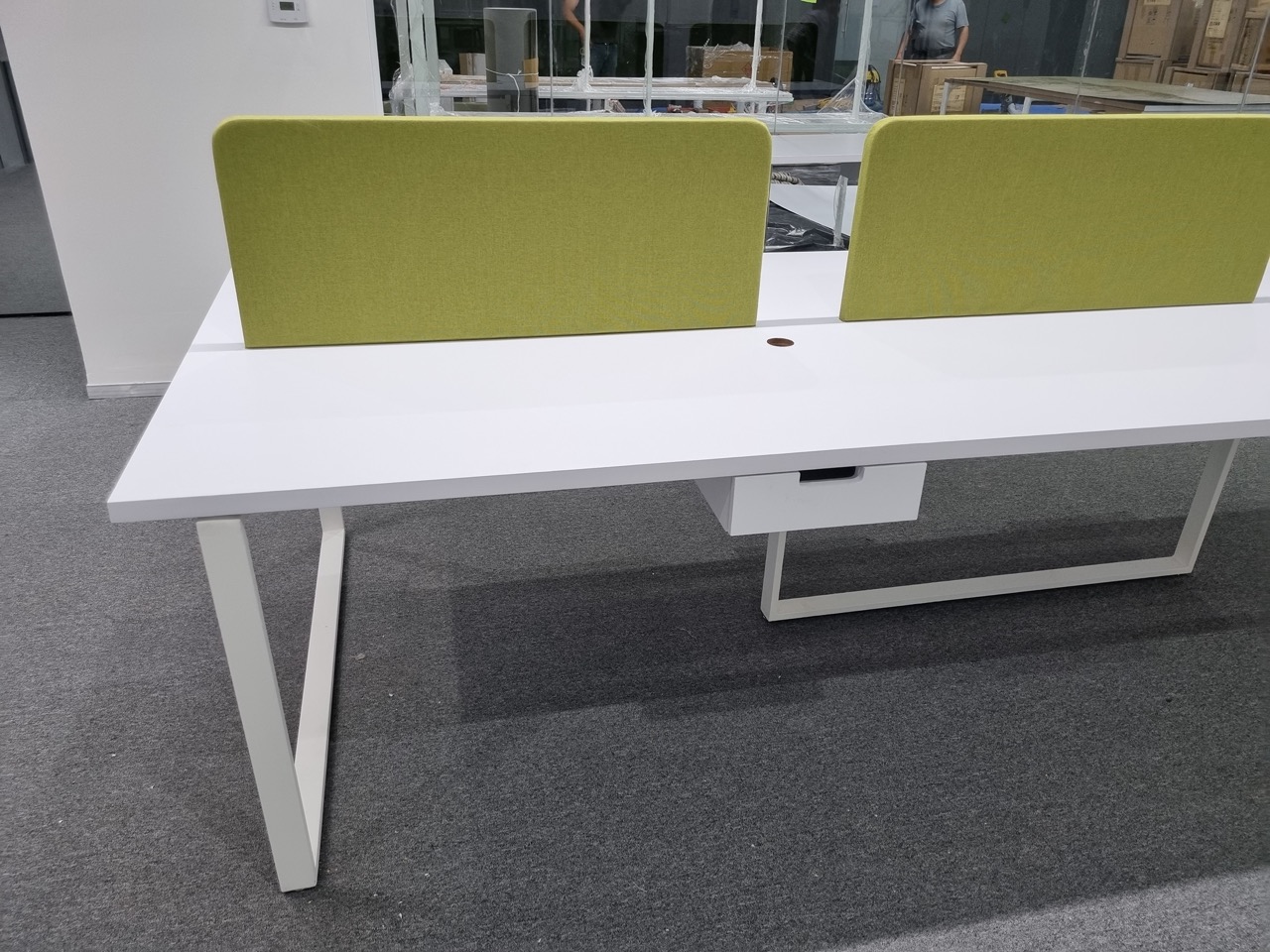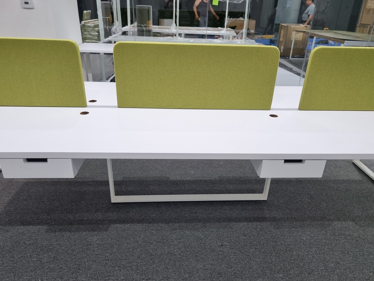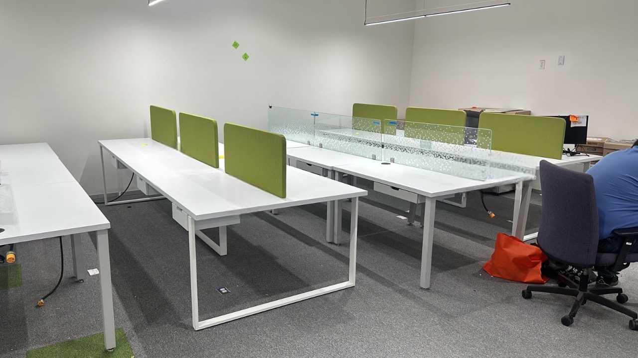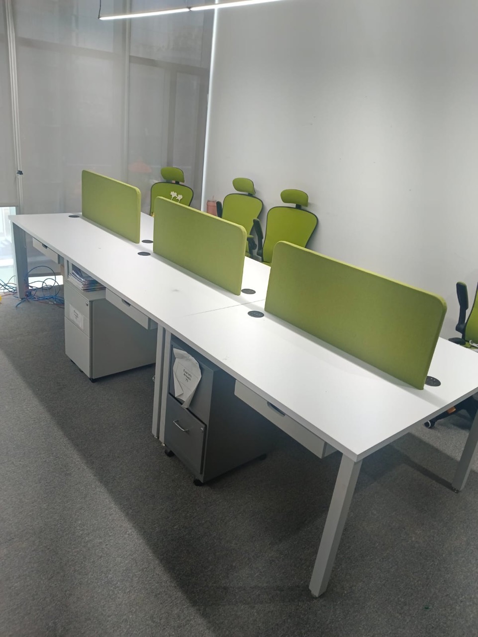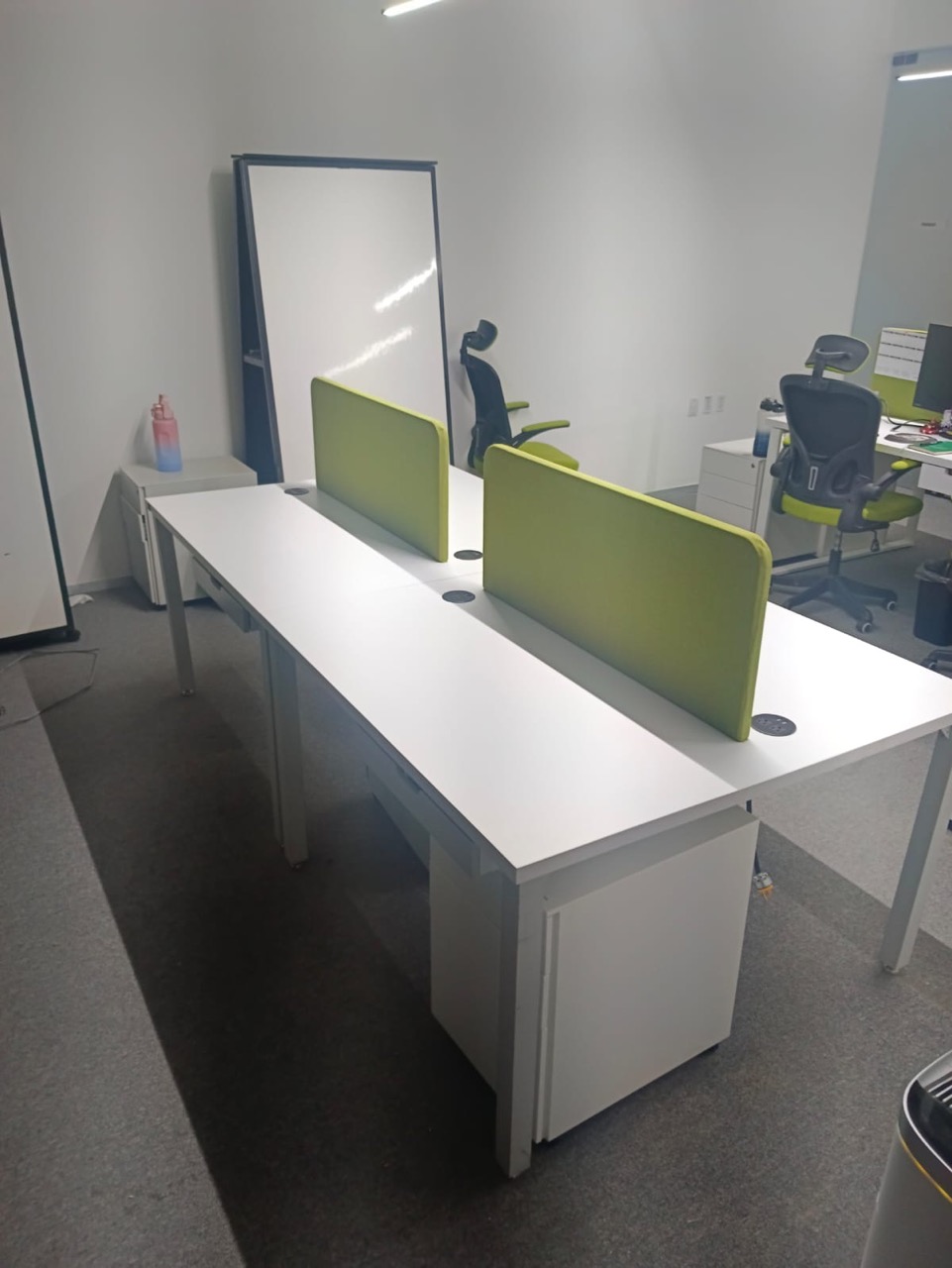Se han fabricado escritorios con cubierta de MDF en color blanco, conforme a las medidas generales solicitadas por el cliente. Los escritorios incluyen mamparas divisorias revestidas en tela Dublín de color verde manzana, así como un ojal de alimentación eléctrica para computadora y una canastilla para cables, con el fin de proporcionar una solución funcional y ordenada para el espacio de trabajo.