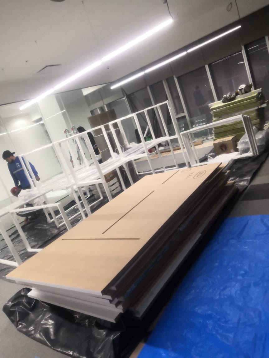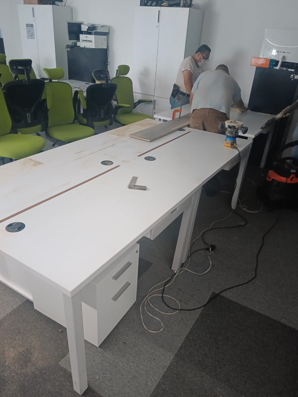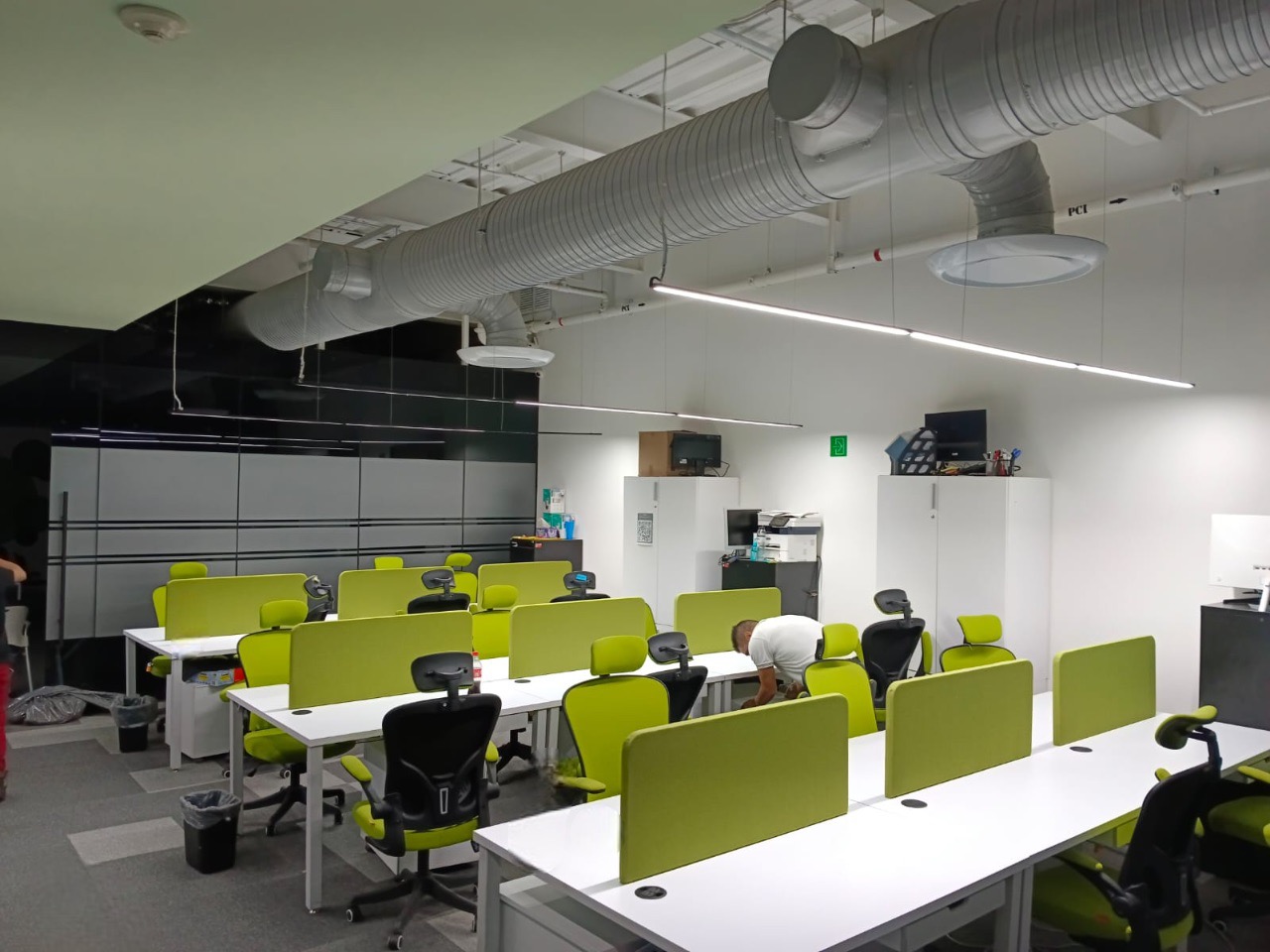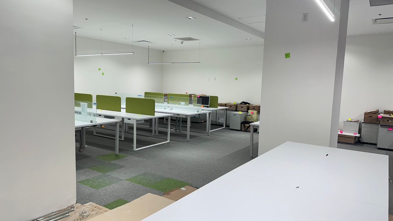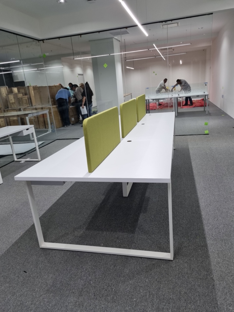 Se han fabricado escritorios con cubierta de MDF en color blanco, conforme a las medidas generales solicitadas por el cliente. Los escritorios incluyen mamparas divisorias revestidas en tela Dublín de color verde manzana, así como un ojal de alimentación eléctrica para computadora y una canastilla para cables, con el fin de proporcionar una solución funcional y ordenada para el espacio de trabajo.