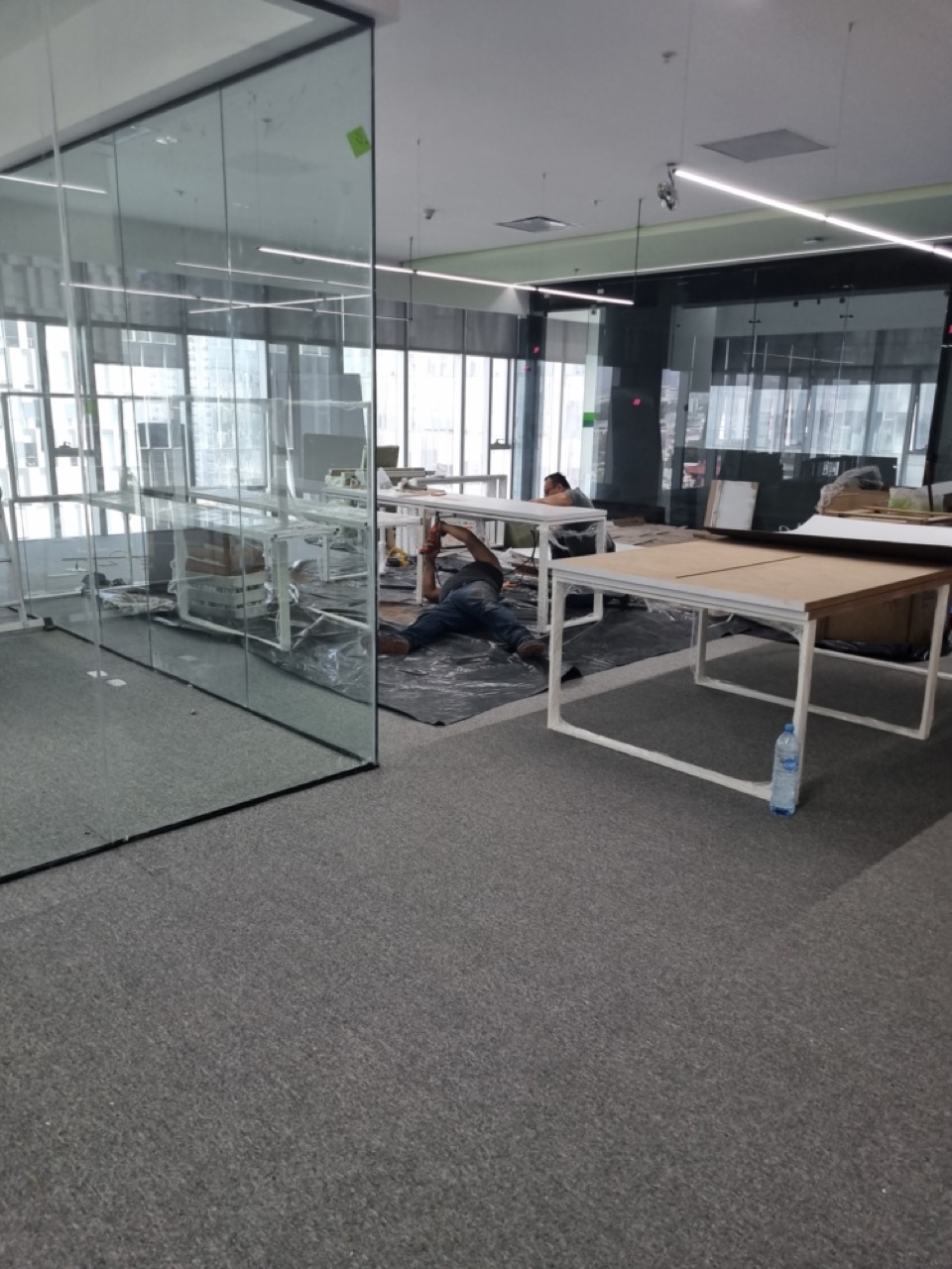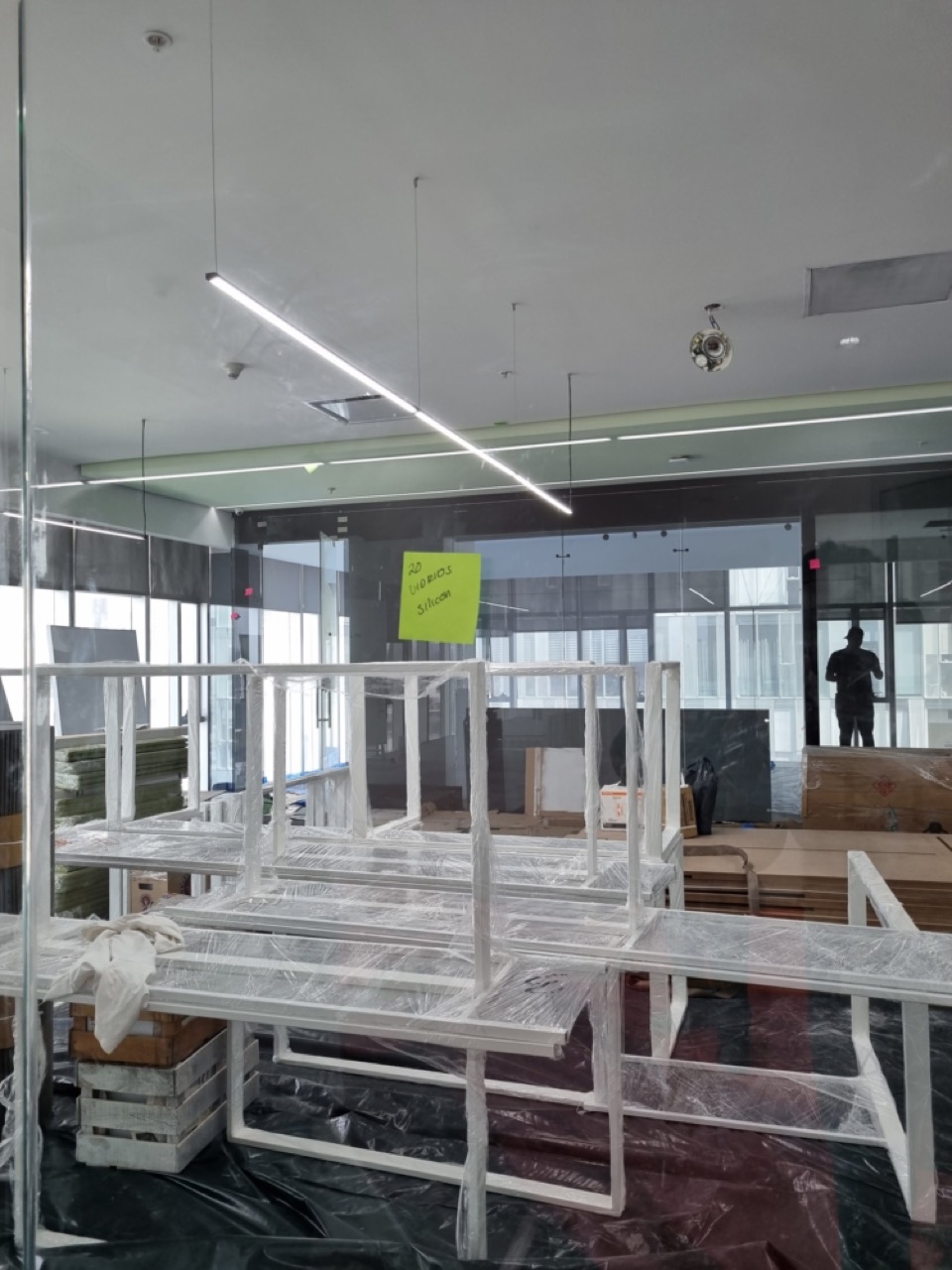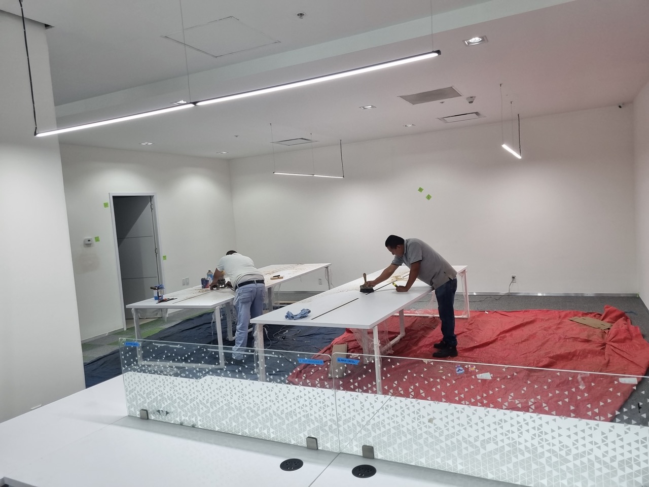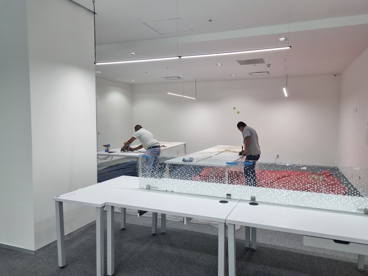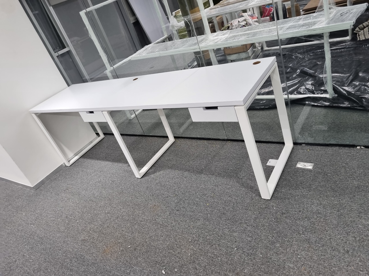 Se han fabricado escritorios con cubierta de MDF en color blanco, conforme a las medidas generales solicitadas por el cliente. Los escritorios incluyen mamparas divisorias revestidas en tela Dublín de color verde manzana, así como un ojal de alimentación eléctrica para computadora y una canastilla para cables, con el fin de proporcionar una solución funcional y ordenada para el espacio de trabajo.