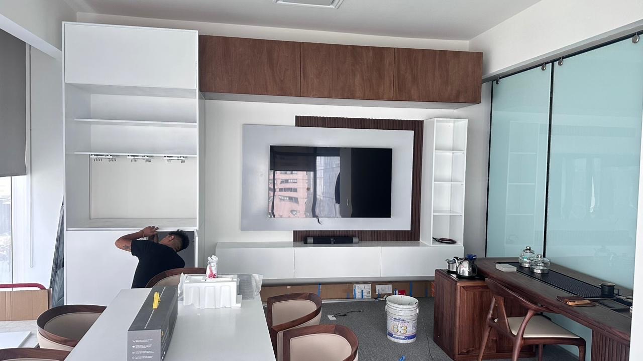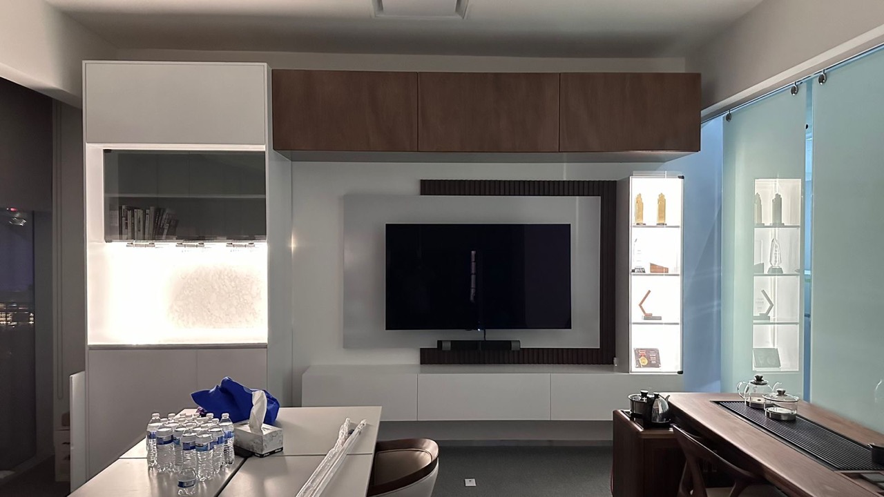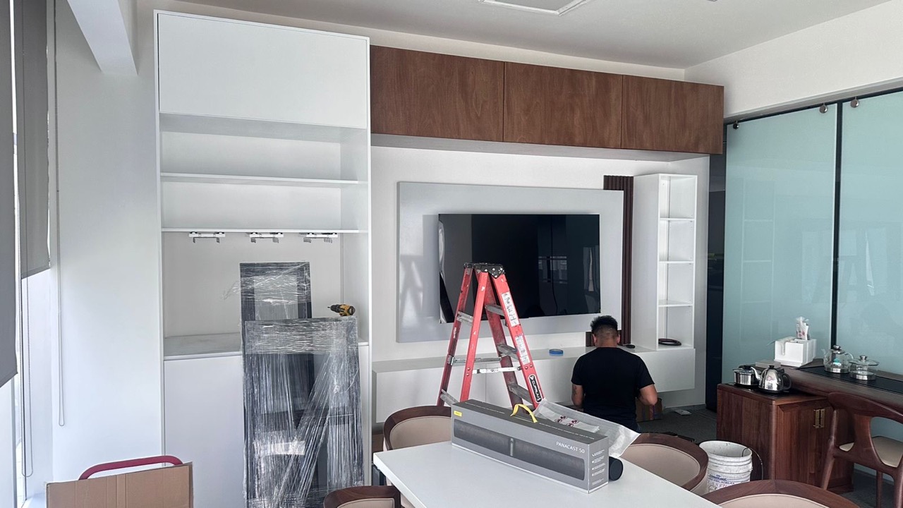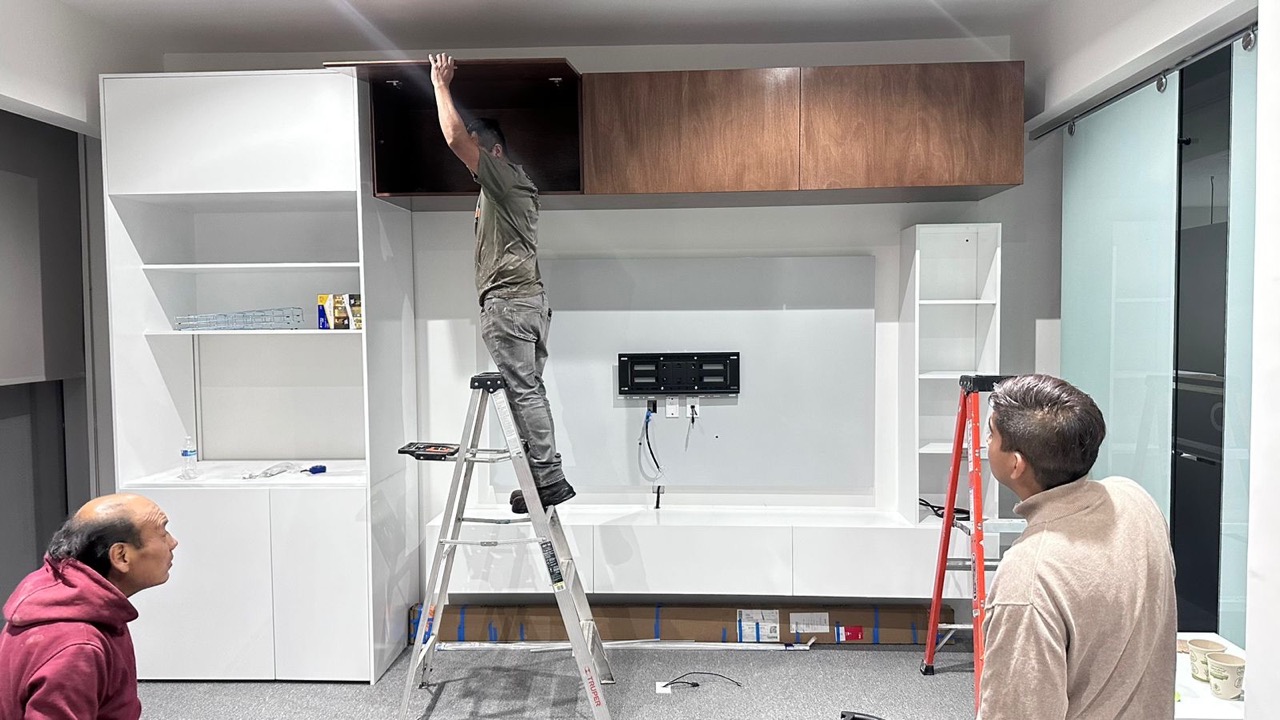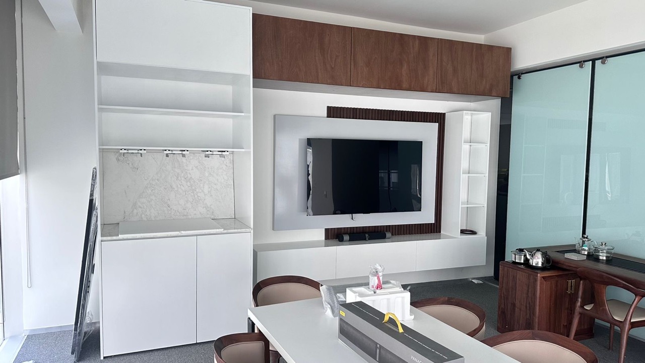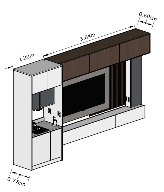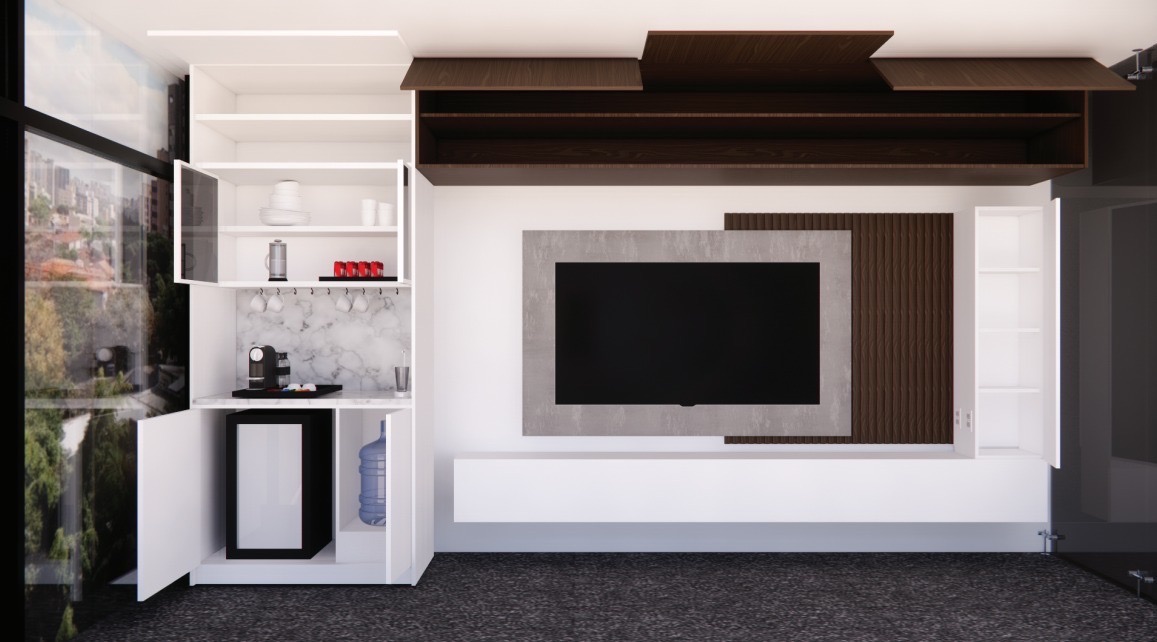 Se elaboró el diseño y la fabricación del mueble «Mezzanine» para una oficina privada, en donde se llevan a cabo reuniones y juntas de trabajo, combinando funcionalidad y elegancia. El mueble presenta acabados en madera de tonos oscuros, con una cubierta de mármol blanco y gabinetes superiores e inferiores para almacenamiento. Incluye puertas de vidrio ahumado en color negro y un elegante lambrín de madera detrás del área destinada para la televisión.