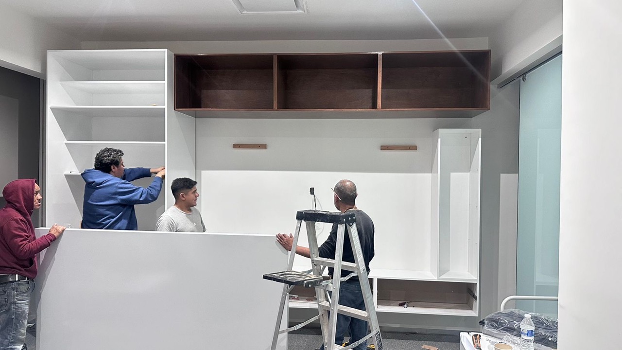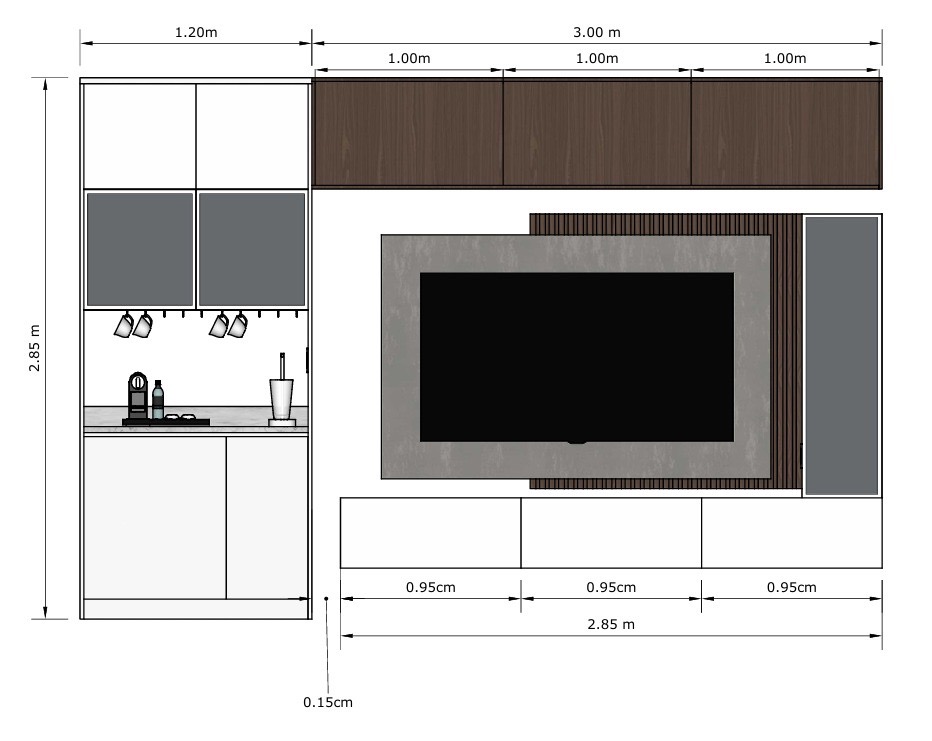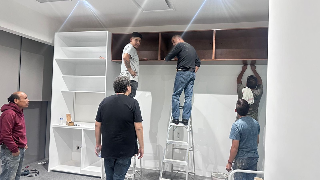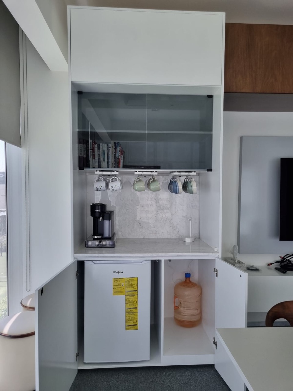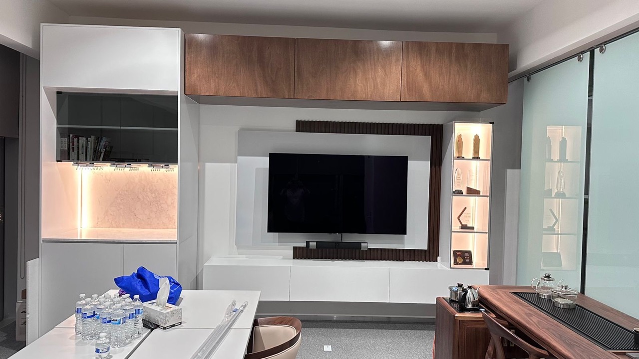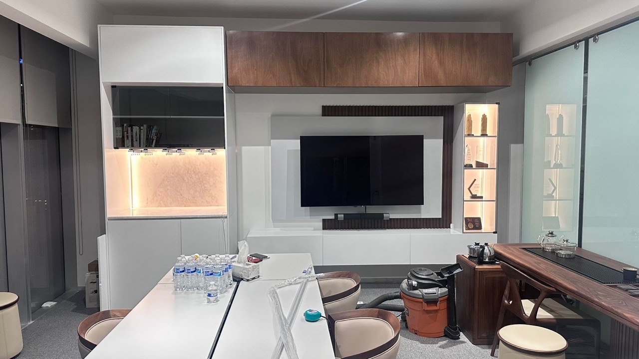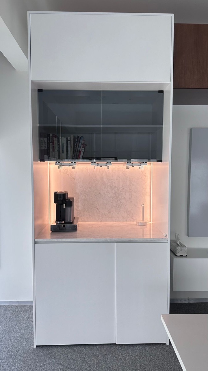 Se elaboró el diseño y la fabricación del mueble «Mezzanine» para una oficina privada, en donde se llevan a cabo reuniones y juntas de trabajo, combinando funcionalidad y elegancia. El mueble presenta acabados en madera de tonos oscuros, con una cubierta de mármol blanco y gabinetes superiores e inferiores para almacenamiento. Incluye puertas de vidrio ahumado en color negro y un elegante lambrín de madera detrás del área destinada para la televisión.