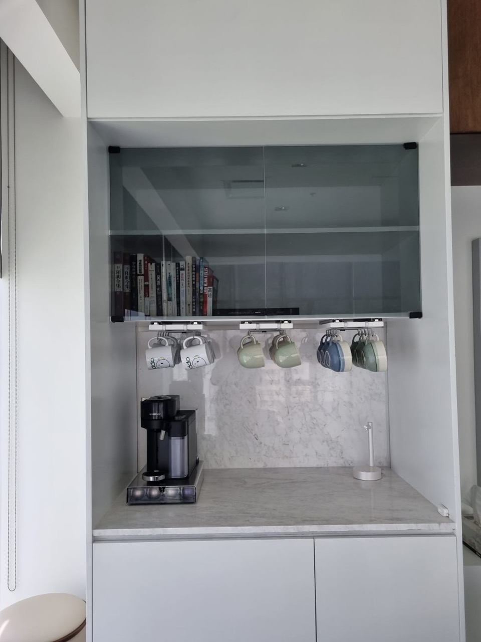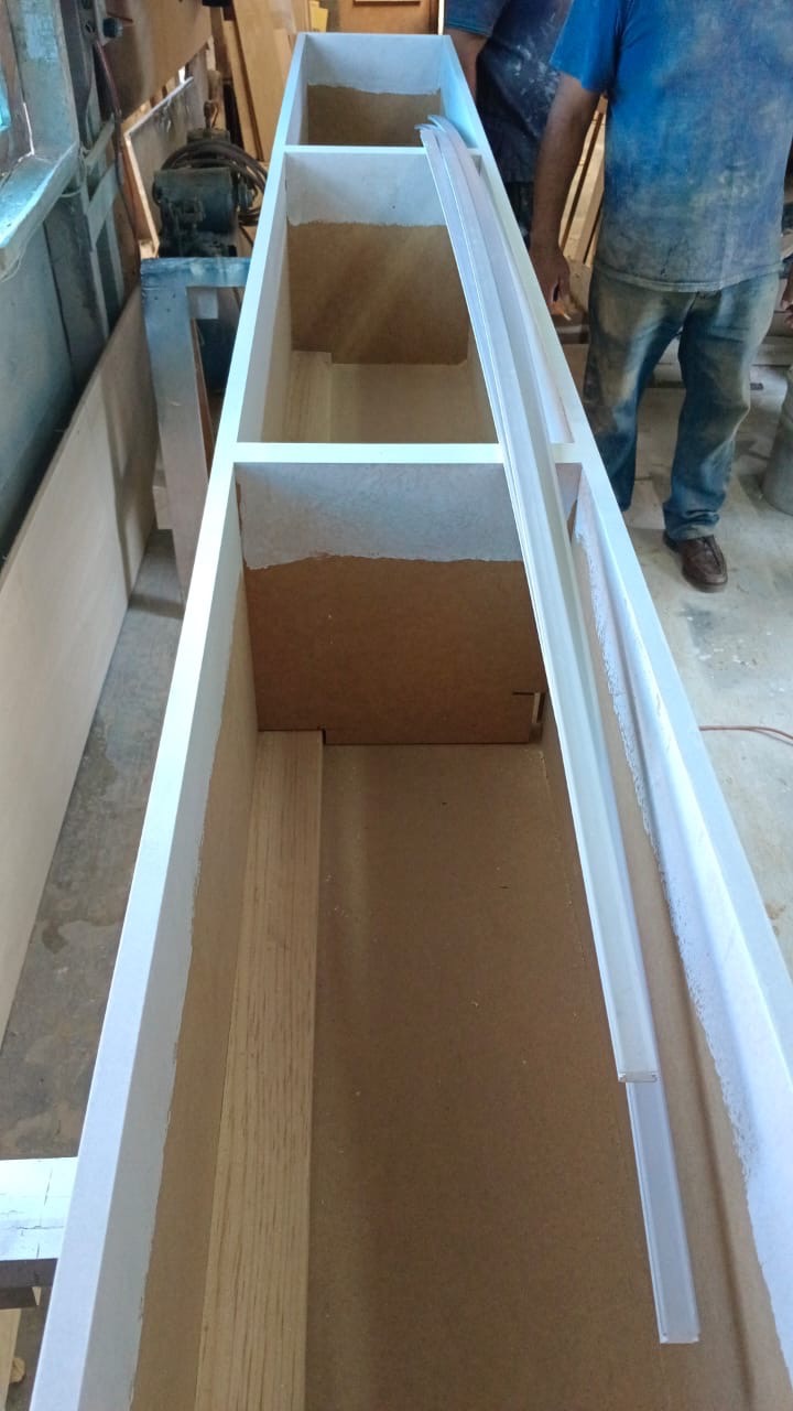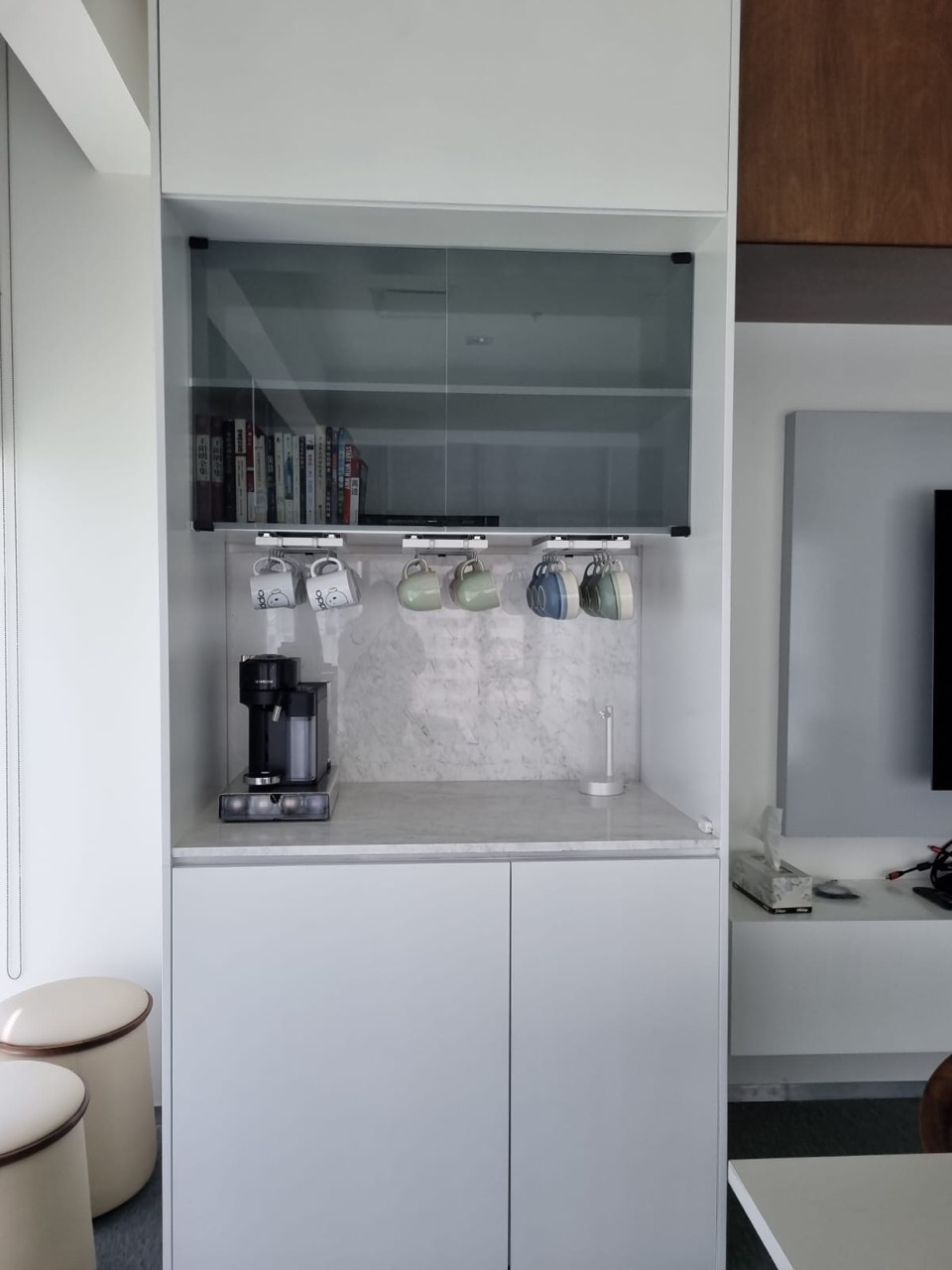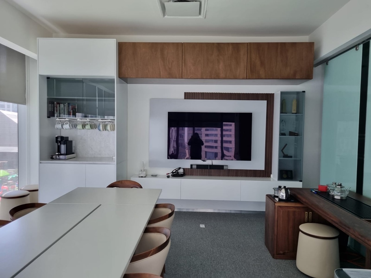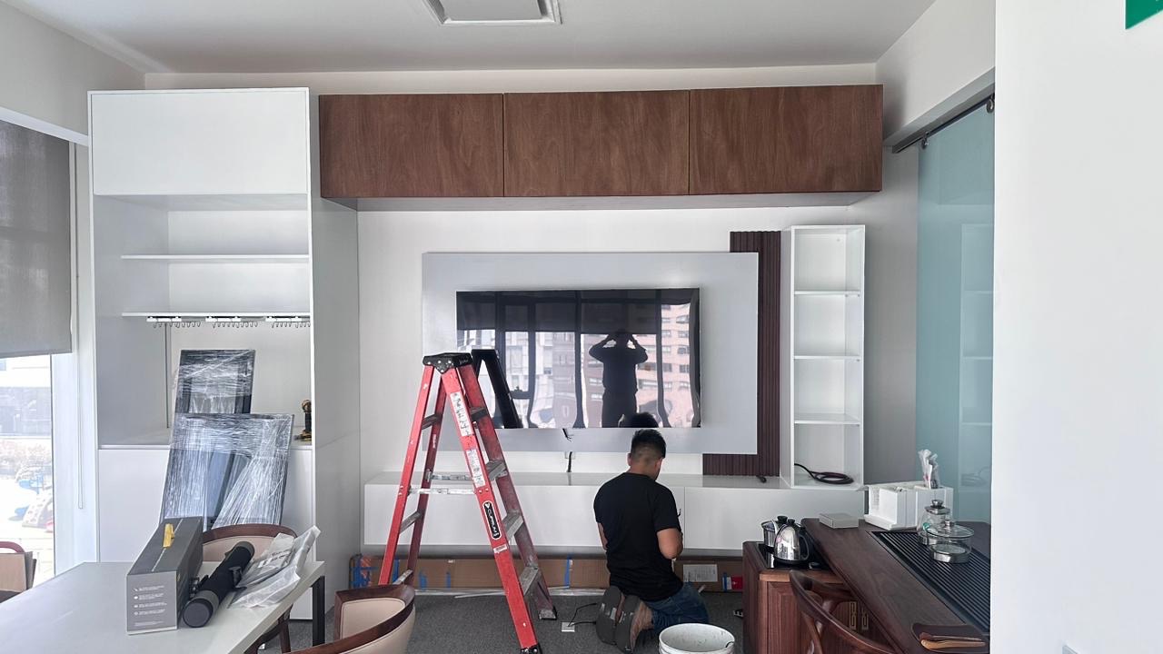 Se elaboró el diseño y la fabricación del mueble «Mezzanine» para una oficina privada, en donde se llevan a cabo reuniones y juntas de trabajo, combinando funcionalidad y elegancia. El mueble presenta acabados en madera de tonos oscuros, con una cubierta de mármol blanco y gabinetes superiores e inferiores para almacenamiento. Incluye puertas de vidrio ahumado en color negro y un elegante lambrín de madera detrás del área destinada para la televisión.