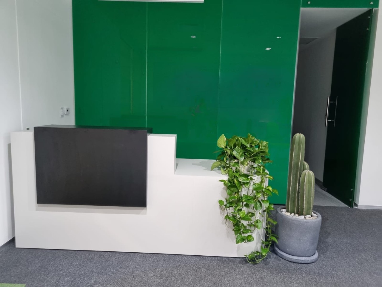 Elegante mueble para recepción, fabricado en madera de tonalidad blanca.
