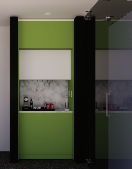 Mueble «Coffer Bar» para oficina, creado para integrar funcionalidad y estética en un entorno moderno y profesional.